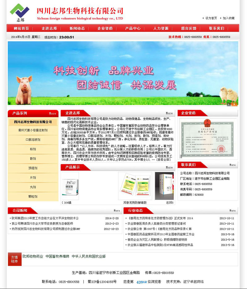 摘要:四川志邦生物科技有限公司是致力動(dòng)物藥品、動(dòng)物保健品、生物制品研發(fā)、生產(chǎn)、銷(xiāo)售的現代化高新技術(shù)企業(yè)。公司是中國動(dòng)物保健品協(xié)會(huì )會(huì )員單位,中國畜牧畜醫學(xué)會(huì )動(dòng)物藥品學(xué)分會(huì )理事單位,四川省動(dòng)物保健品協(xié)會(huì )常務(wù)理事單位,公司位于遂寧市創(chuàng )新工業(yè)園區,總投資3000萬(wàn)元,占地28000余平方米,于2012年7月12日順利通過(guò)農業(yè)部獸藥GMP驗收,F建有最終滅菌小容量注射劑、口服溶液劑、片劑、顆粒劑、丸劑、粉劑、散劑、預混劑、粉針劑、消毒劑等多條生產(chǎn)線(xiàn),擁有標準的GMP廠(chǎng)房,凈化車(chē)間、質(zhì)檢室、無(wú)菌室、動(dòng)物實(shí)驗室、辦公大樓和完善的質(zhì)量管理體系。....